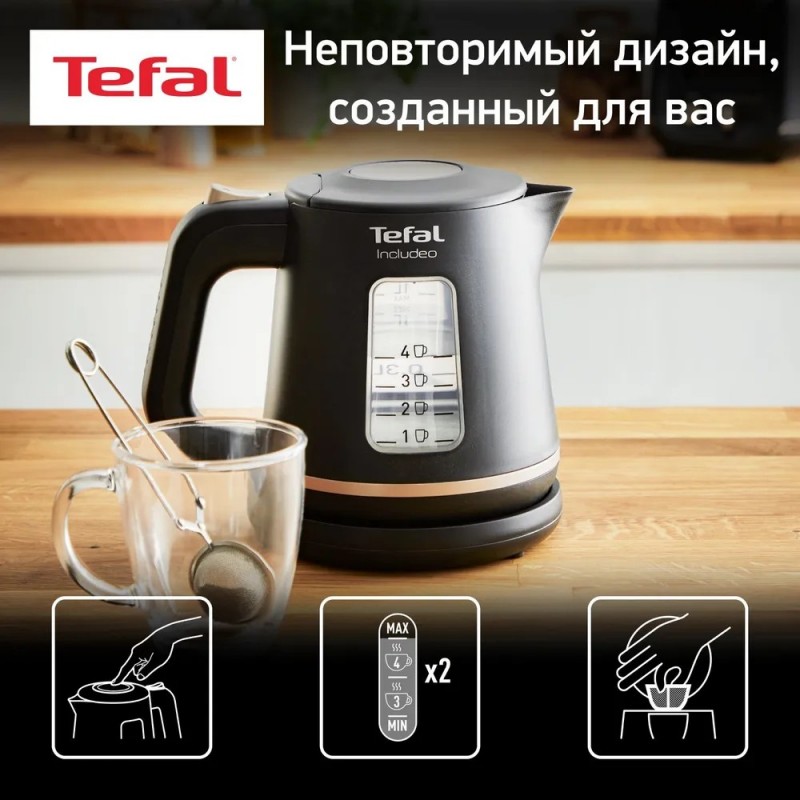 Линейка Tefal Includeo разработана нашими дизайнерами совместно с покупателями, благодаря чему она удовлетворит потребности каждого. Электрический чайник с эргономичным и удобным дизайном оснащен простыми и полезными функциями: легкое открытие крышки нажатием большой кнопки, кнопка включения/выключения с подсветкой, два больших индикатора уровня воды в литрах или чашках, а также основанием с поворотом на 360 градусов для удобного размещения. Идеально подходит для приятного и легкого ежедневного использования.