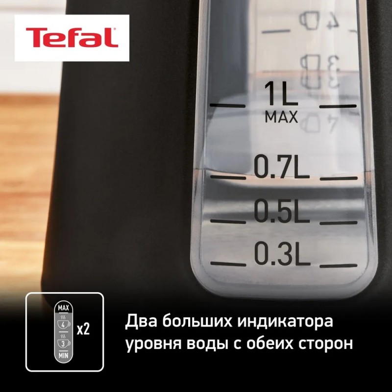 Два индикатора уровня водыДва больших индикатора уровня воды с обеих сторон с большими, четкими и хорошо читаемыми отметками в литрах или чашках.